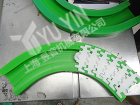 轉(zhuǎn)彎導(dǎo)軌結(jié)構(gòu)簡單,外形美觀,表面平滑,噪音低、強(qiáng)度高、耐磨損,轉(zhuǎn)彎處過渡靈活,沒有輸送物體滯留,使輸送物不倒、不卡、不堵,輸送更流暢,可設(shè)計(jì)成不同的輸送半徑、不同的輸送寬度,上、下導(dǎo)軌采用多排鏈板銷槽,以及上、下鏈板銷槽采用任意槽形的組合搭配,更使導(dǎo)軌多樣化、簡單化,安裝維修方便,提高工作效率,適用于各種要求的輸送轉(zhuǎn)彎場合。